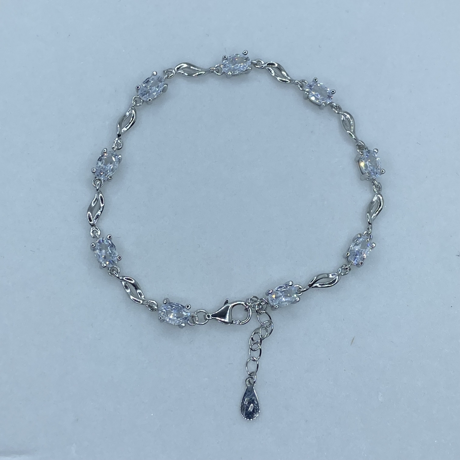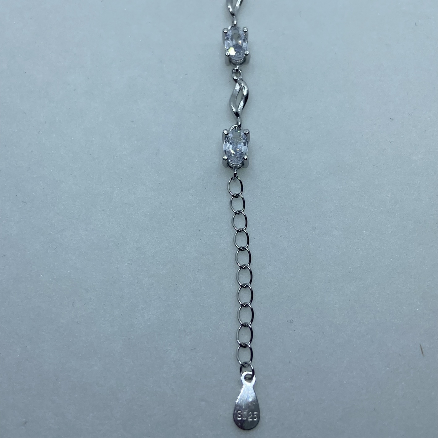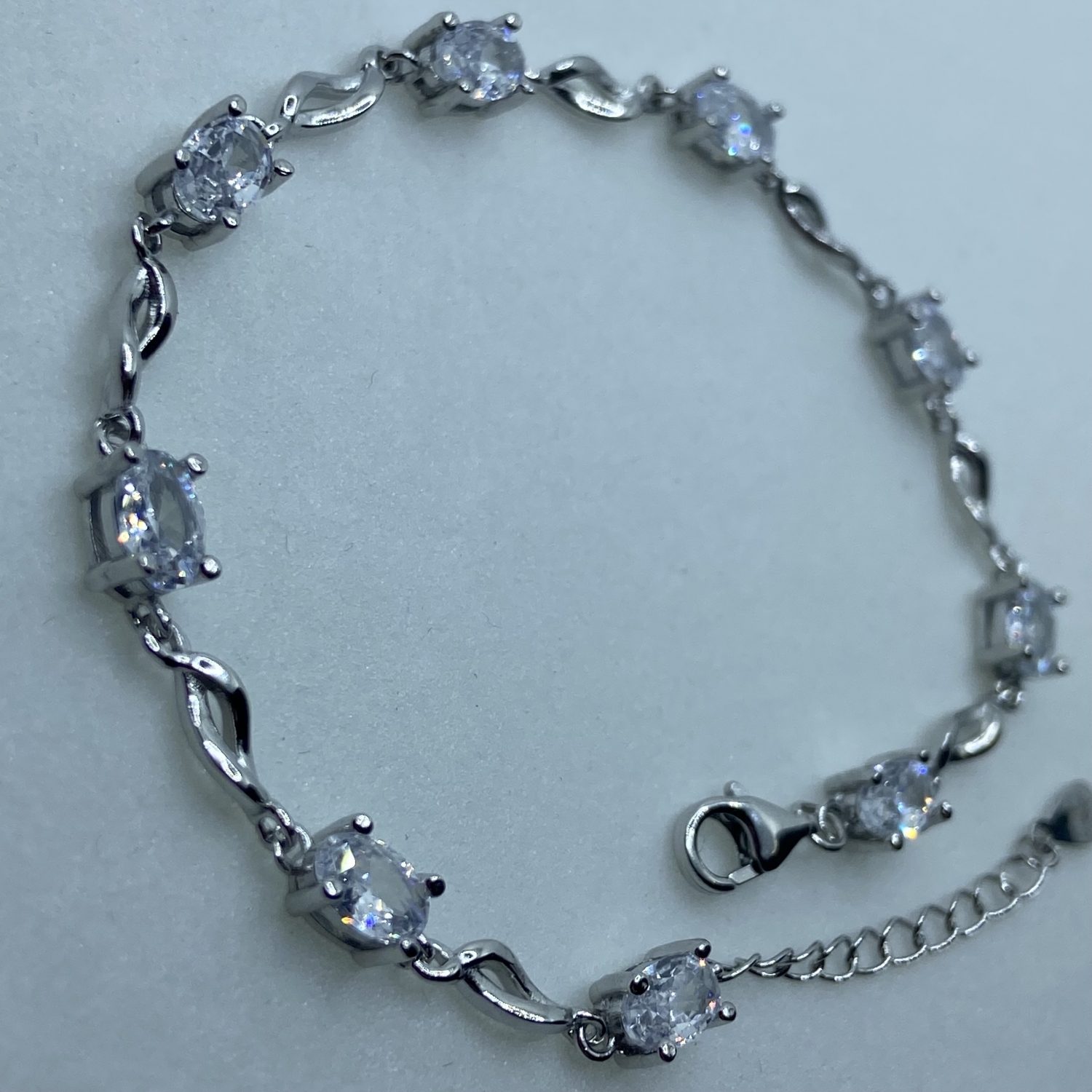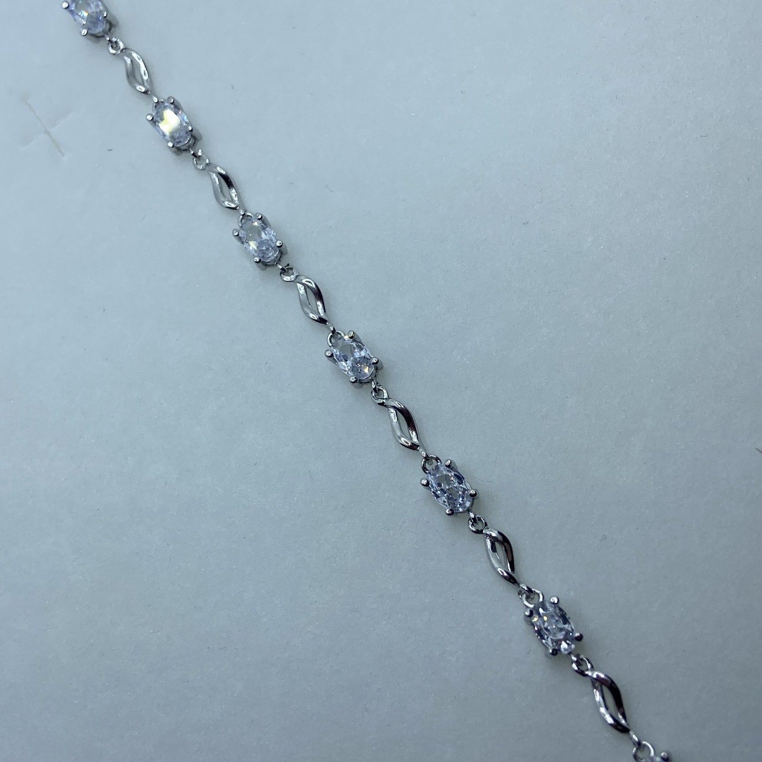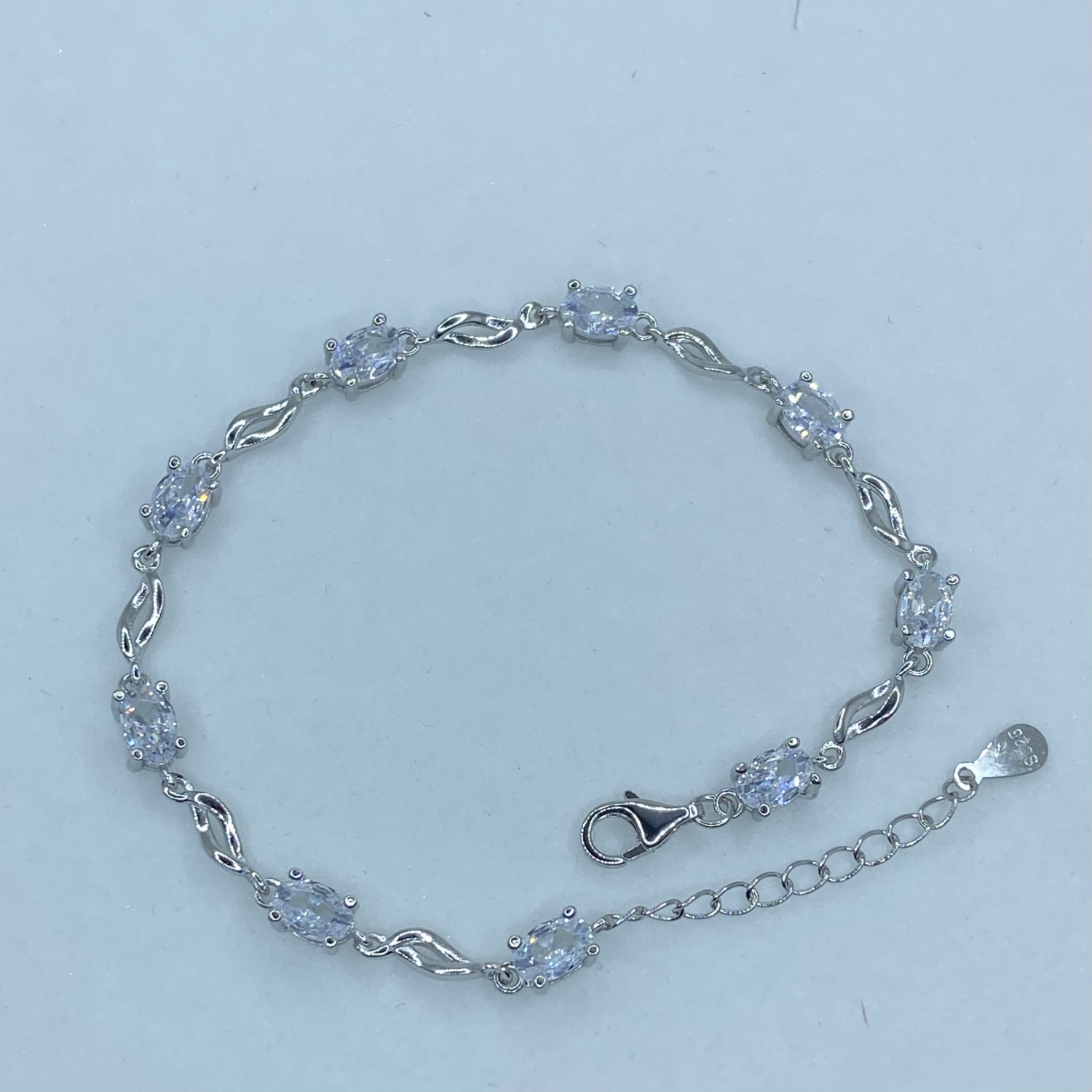 Fehér ovális kövekkel,és modern mintával kirakott ezüst karlánc,ródiumozott felülettel.Szélessége:4,5 mm,hossza 17-20 cm között állítható.